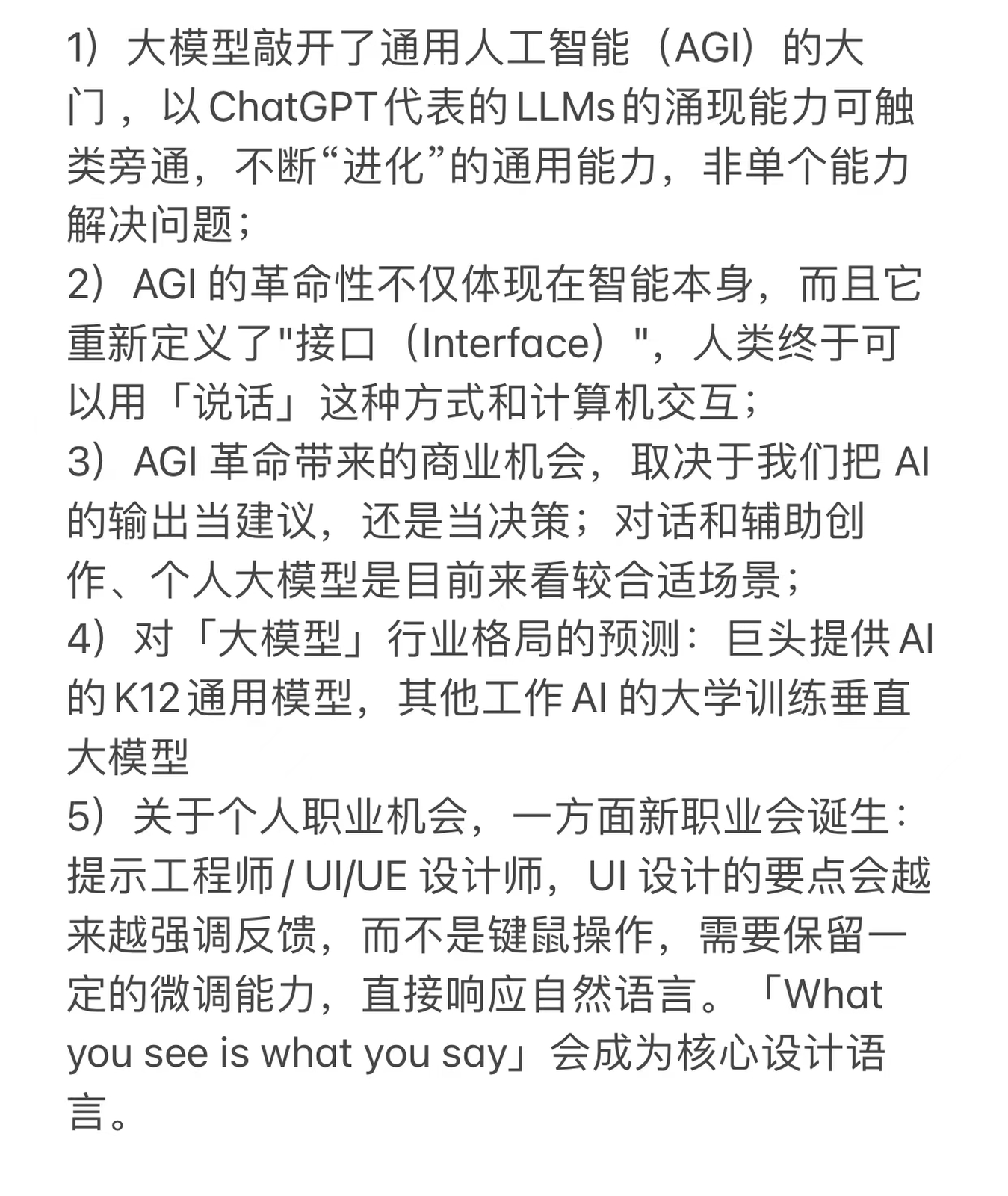 科技投资人王煜全:OpenAI给科技行业敲响警钟,中国必须要有自主“大模型” https://hub.baai.ac.cn/view/24009 此篇采访有很多深入的思考,包括1)生成式AI为何被巨头关注;2)生成式AI商业模式的讨论;3)ChatGPT技术创新性的意义;4)芯片限制后,我国如何发展自己的AI大模型,值得重复阅读和思考。