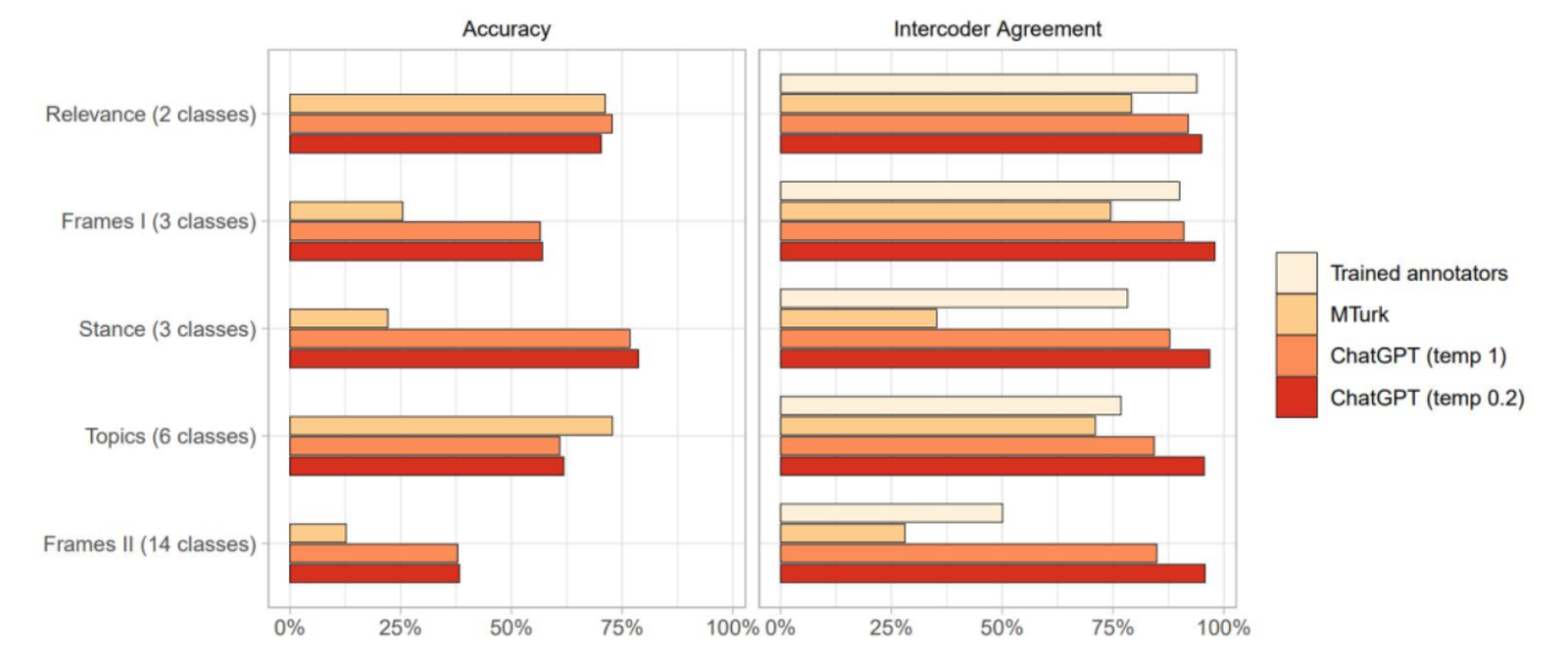 ChatGPT Outperforms Crowd-Workers for Text-Annotation Tasks https://hub.baai.ac.cn/view/25112 https://arxiv.org/abs/2303.15056 ChatGPT在包括相关性、立场、主题和两种框架检测任务中的性能超过人工众包工人,在五分之四的任务上,ChatGPT 的零样本准确率高于 MTurk,且成本便宜20倍。