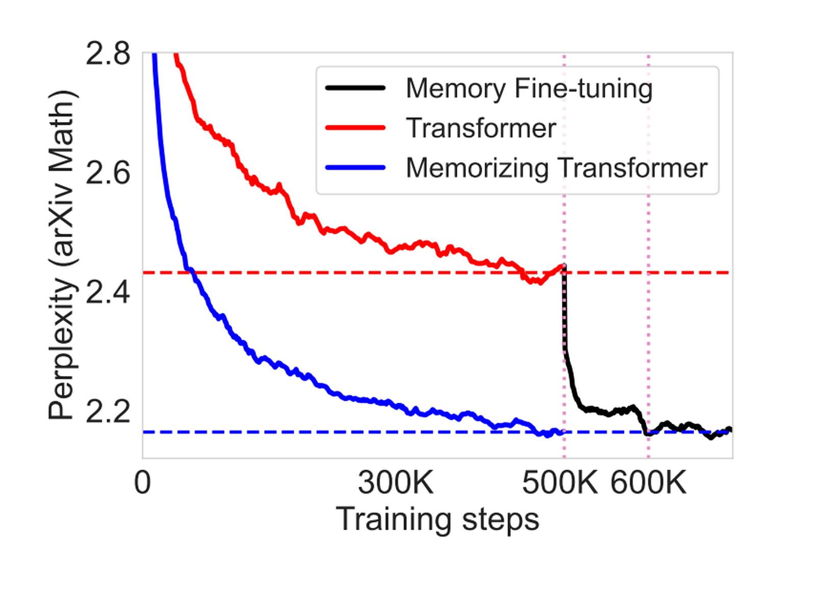 - MEMORIZING TRANSFORMERS https://arxiv.org/pdf/2203.08913.pdf https://hub.baai.ac.cn/view/24957,尝试增加“记忆”机制,提出了kNN-augmented attention,通过使用k-nearest-neighbor lookup外部存储器,增加模型可关注的上下文长度。文中包括从头预训练,或在预训练模型基础上增加记忆,但效率未提及,KNN-LM效率是个问题。