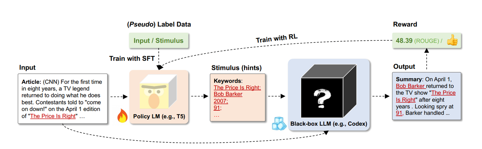 - Guiding Large Language Models via Directional Stimulus Prompting https://arxiv.org/pdf/2302.11520.pdf 使用policy LM生成一个stimulus(一组关键词),即加了一步中间过程:原文-关键词-输出,关键词这里叫stimulus(刺激),剩余方式和ChatGPT一致,SFT->RL。