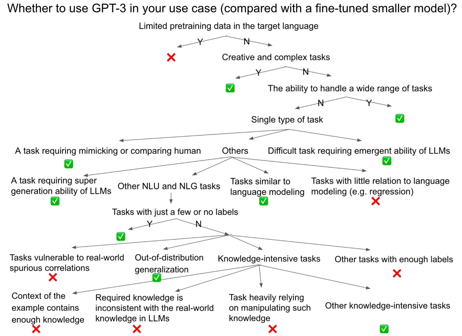 - Why did all of the public reproduction of GPT-3 fail? https://hub.baai.ac.cn/view/24306 https://jingfengyang.github.io/gpt ,写的很好很详尽的一篇文字,解释其他大模型无法复现GPT3的原因,同时给出使用LLM的decision tree,非无脑使用,很多时候在确定任务集,使用微调百亿模型即可达到SOTA。