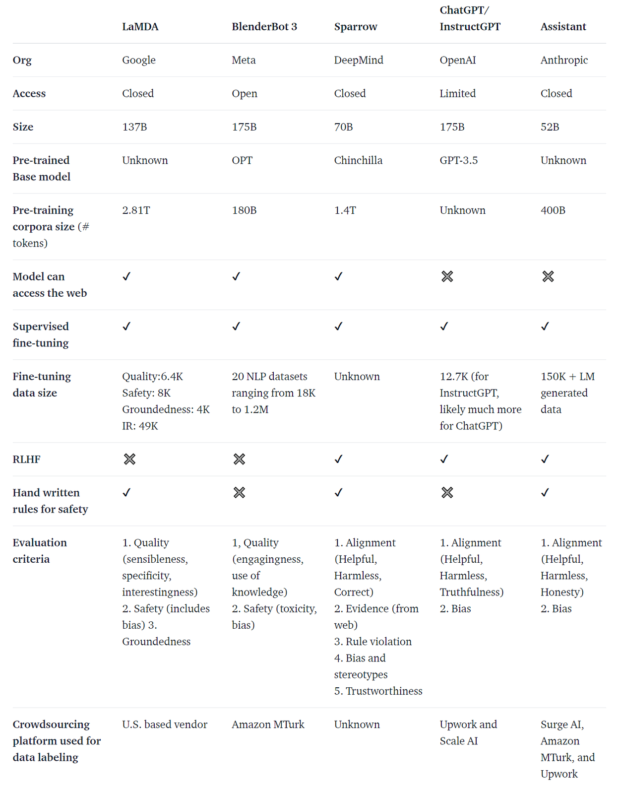 What Makes a Dialog Agent Useful? https://huggingface.co/blog/dialog-agents 简单介绍了以ChatGPT为首的各ChatBot背后的技术重点,包括人工反馈学习(RLHF)、有监督微调(SFT)、指令学习(IFT)和思维链(CoT)