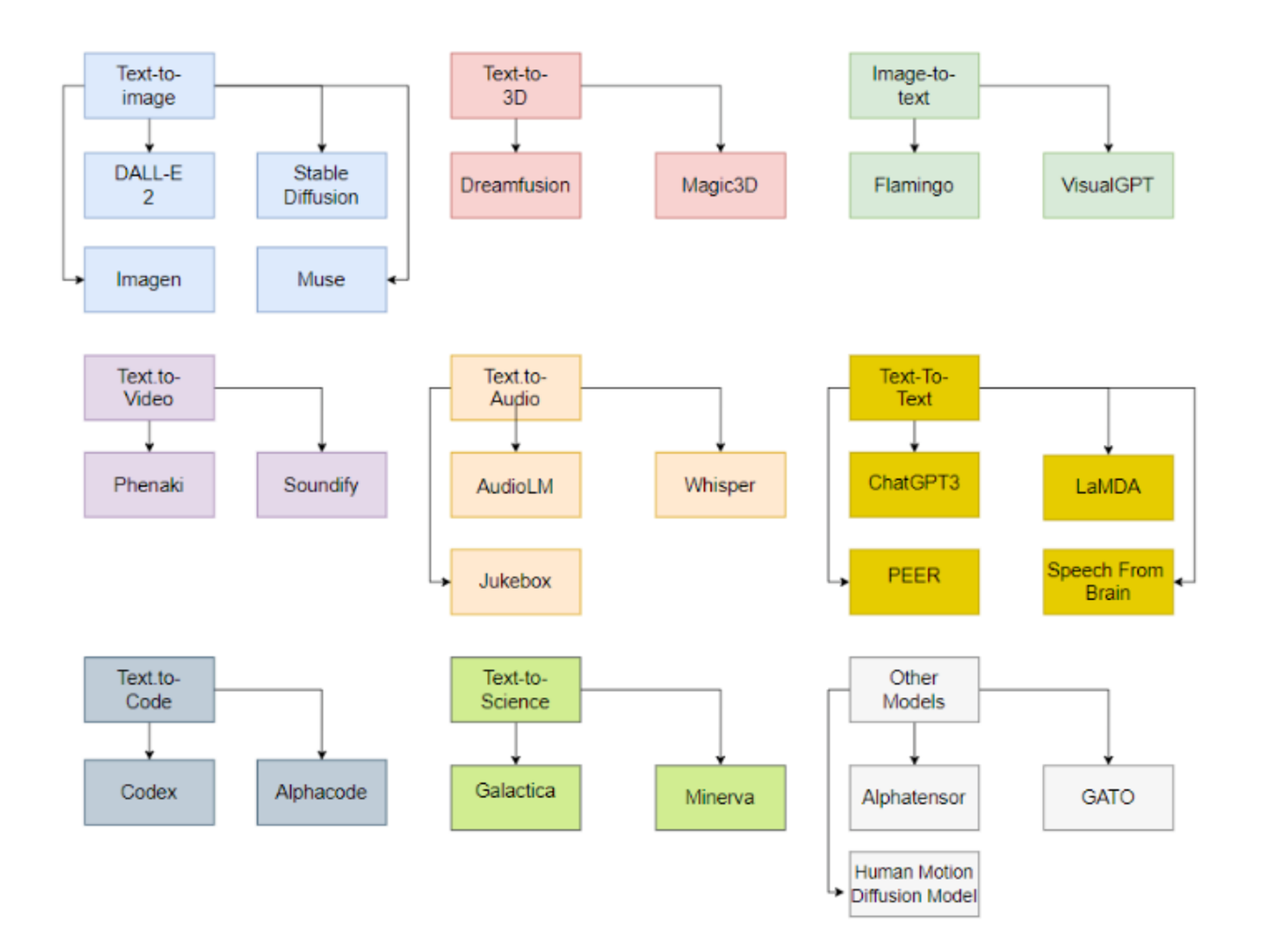 一篇各模态生成模型SOTA的简单综述: https://arxiv.org/pdf/2301.04655.pdf, 方便了解目前各模态的生成sota,图比较粗糙,但归类较好: