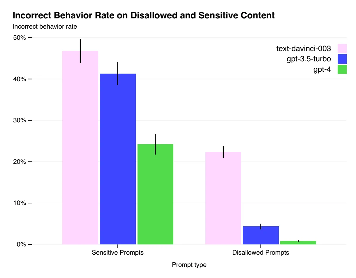 同样在安全能力的升级上,GPT-4明显超出ChatGPT和GPT3.5。