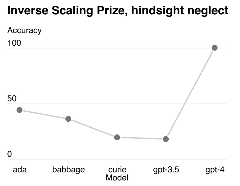 特别对于Inverse Scaling Prize这个任务,此任务提出了模型性能随规模而下降的几个任务,而GPT-4可以通过提前预测模型扩展性,从而在Inverse Scaling Prize上的Hindsight Neglect任务逆转这一趋势。