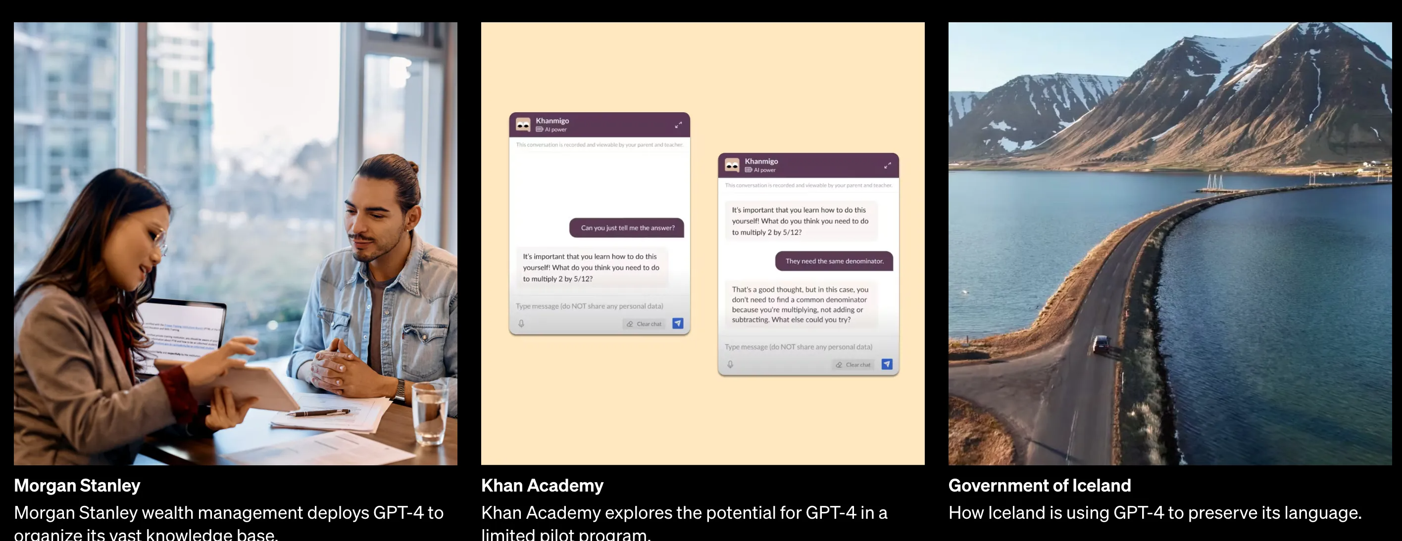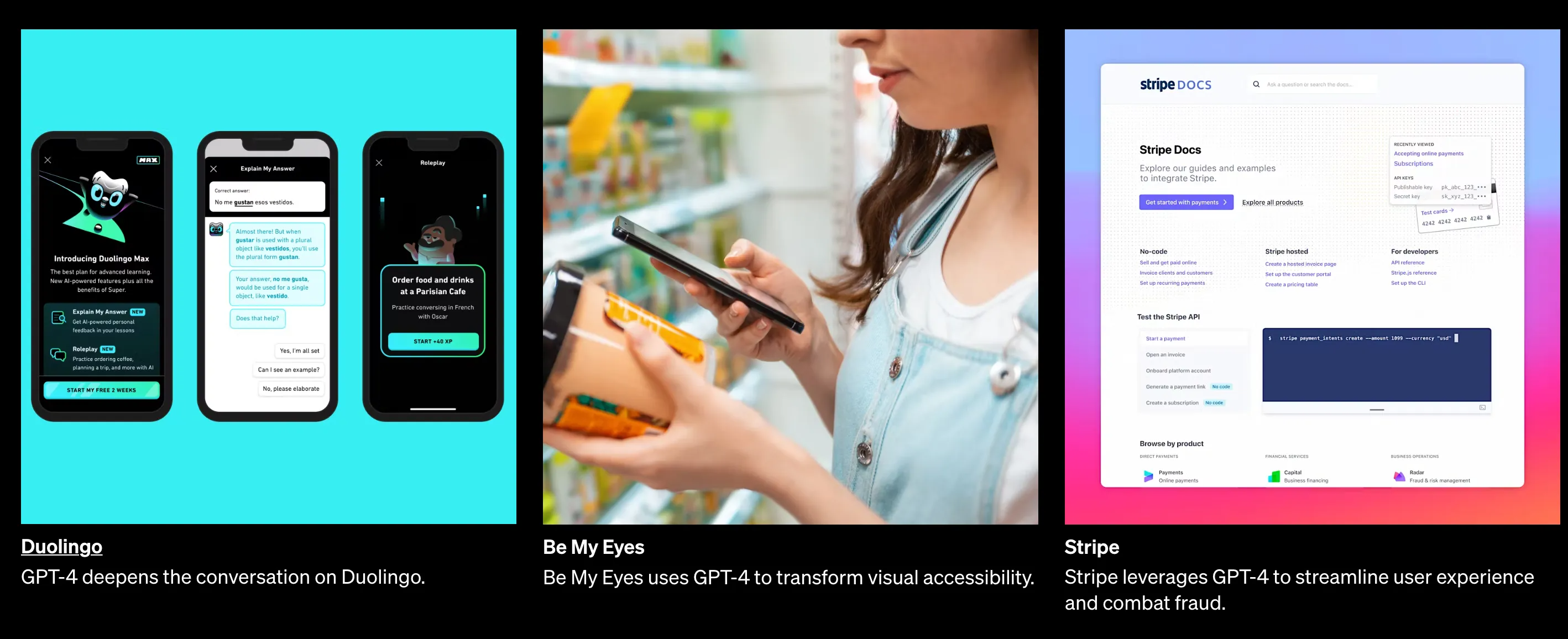 2) 加入视觉模态后,可以扩充到盲人应用(Be my eyes);强大的多语言能力帮助小语种语言的恢复(Iceland language preserve)、安全能力提升后的反欺诈(Stripe)等应用会应运而生: