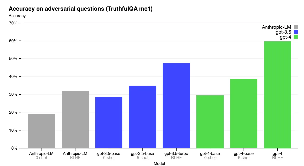 GPT-4在生成逻辑性和准确性上均取得了进展,需要注意的是,GPT-4基础模型在这项任务上只比GPT-3.5略好一点;然而经过RLHF的后训练后,效果才有了较大的改进,后训练整个过程类似于做Prompt Engineering+RLHF,核心是让模型知道如何在正确的垂直场景下做出合适的回答。