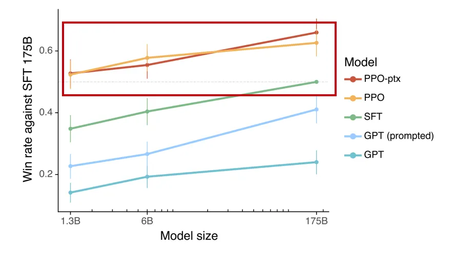 和ChatGPT RLHF的方法类似,Alignment(对齐工作)在此处发挥了较大作用,同时未来也会有持续的发力空间,相比单纯累积模型参数量和数据量的“大力出奇迹”方式,其计算量相对较小。如下图,在InstructGPT文献中,加入RLHF的1.3B模型,在整体胜出率上,超出了175B的微调模型,节省了100倍的成本;