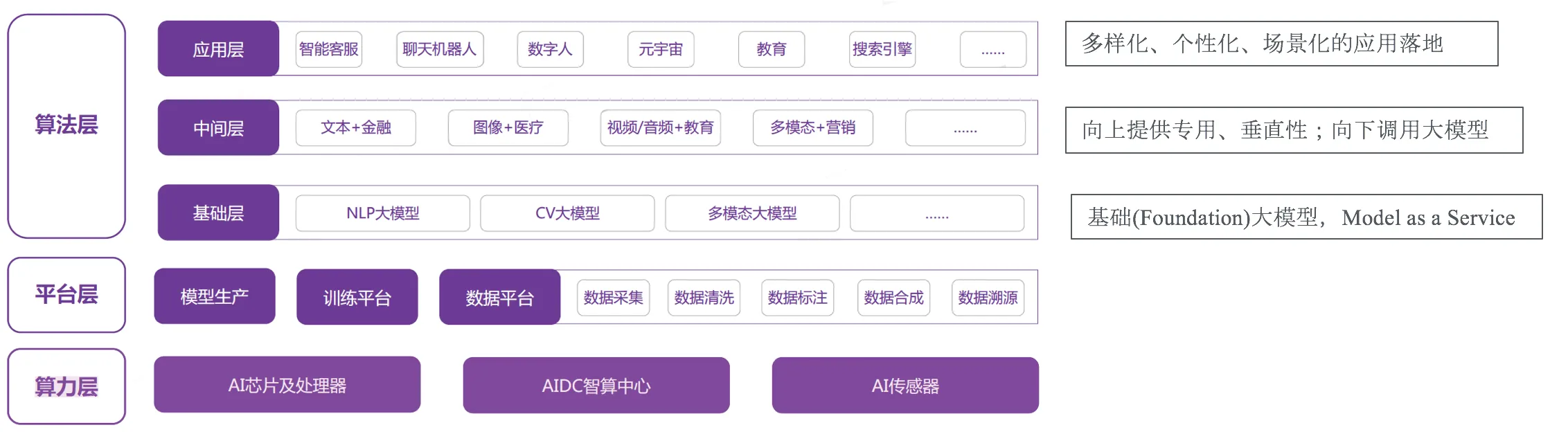 对于行业来说,不同层级的公司,需要在不同模块找立足点。初步来看,初创企业适合入局中间层、数据平台和应用层,大厂适合入局算力、平台和基础层。